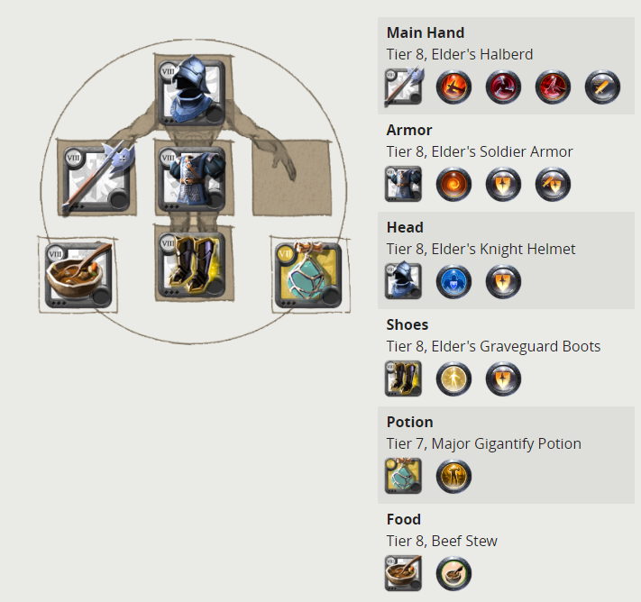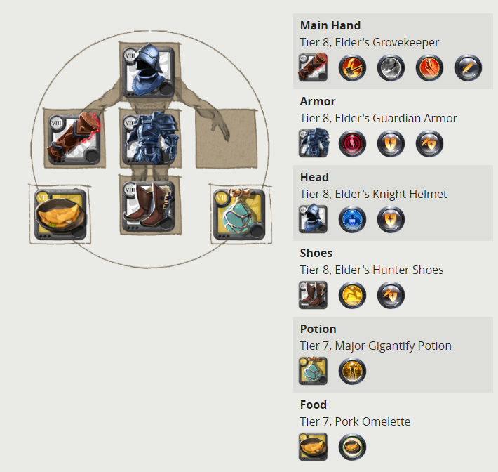 Grovekeeper, Knight helmet/Soldier helmet, Guardian armor/Judicator armor, Hunter shoes
