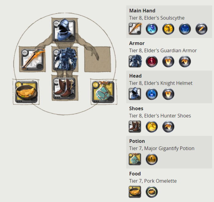Soulscythe, Knight helmet, Soldier helmet, Guardian armor/Knight armor, Hunter shoes