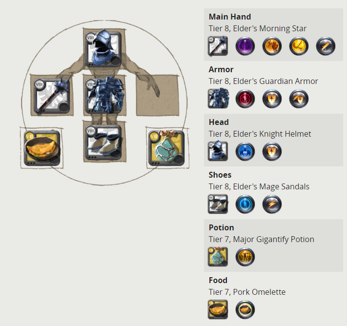 Morning star, Knight helmet/Judicator helmet, Guardian armor, Mage sandals