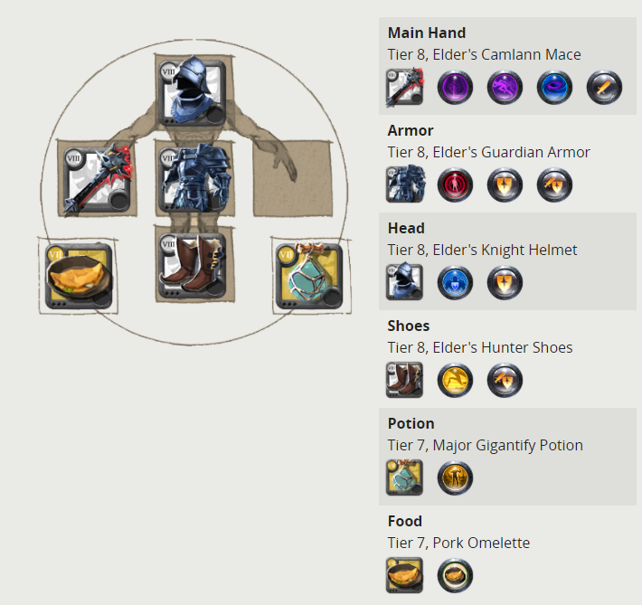 Camlann Mace, Knight helmet/Judicator helmet, Guardian armor/Judicator armor, Hunter shoes