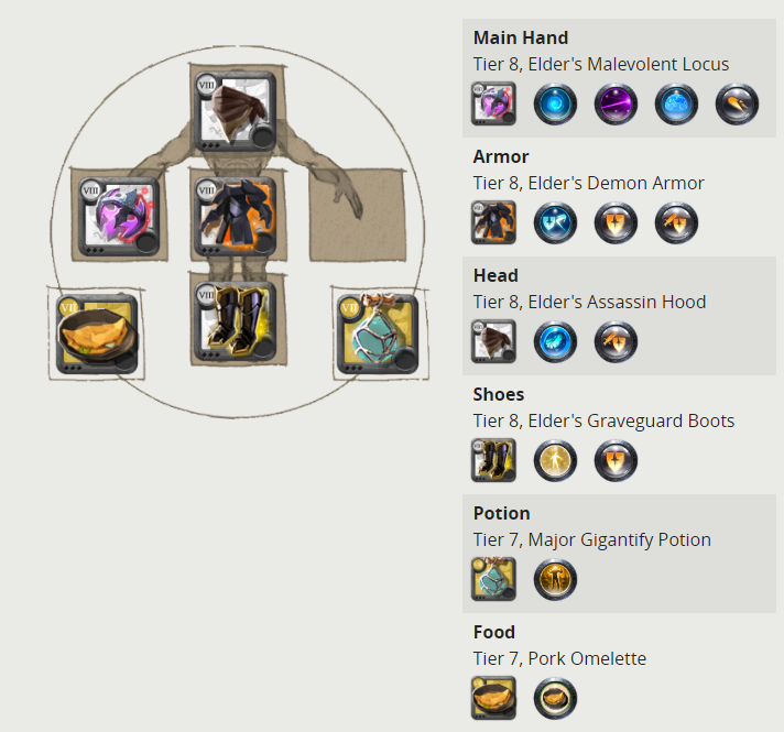 Malevolent Locus, Assasin Hood/Knight helmet, Demon armor/Judicator armor, Graveguard boots