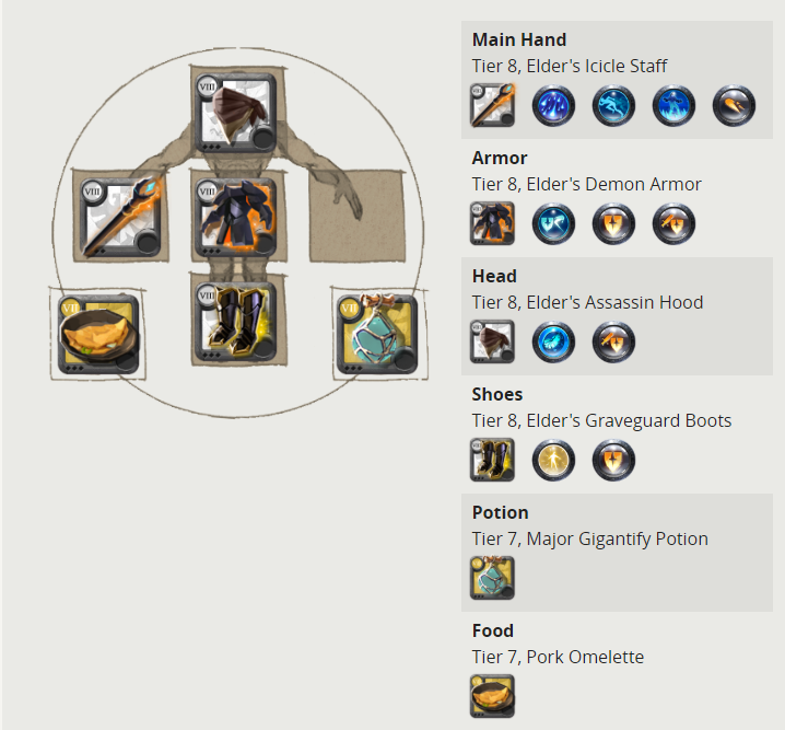 Icicle staff, Assasin hood/Knight helmet, Demon armor/Judicator armor, Graveguard boots