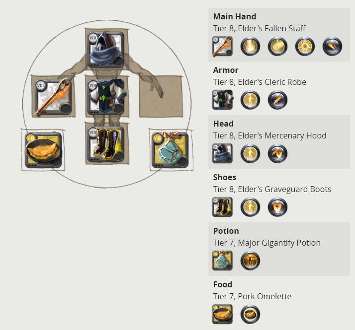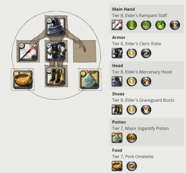 Rampant staff/Wild staff, Mercenary hood/Knight helmet, Cleric robe, Graveguard boots/Scholar sandals