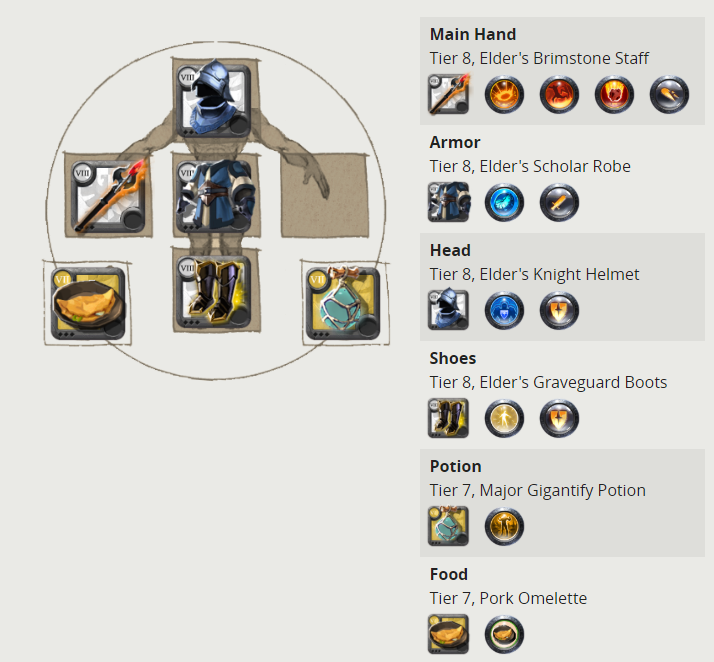 Brimstone staff, Knigh helmet/Royal hood, Scholar robe, Graveguard boots