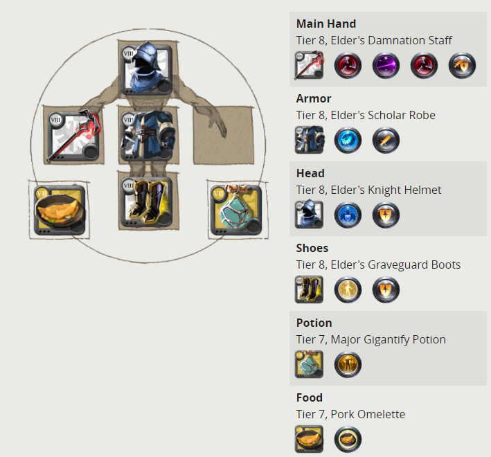 Damnation staff, Knight helmet/Royal hood, Scholar robe, Graveguard boots