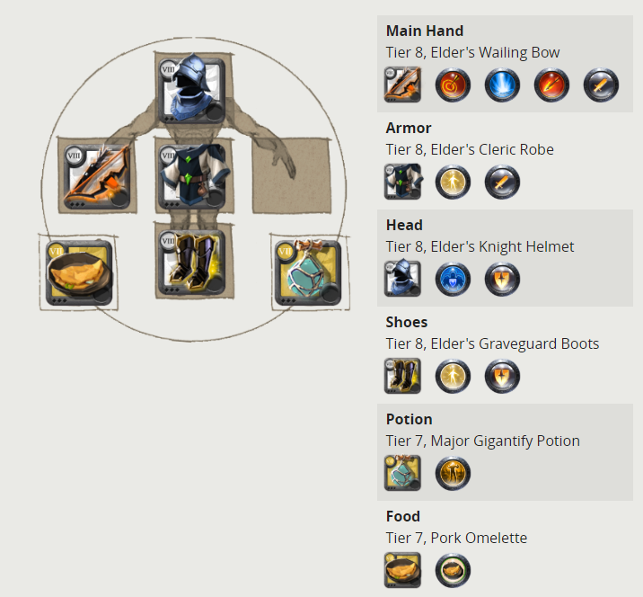 Wailing bow, Knight helmet/Royal hood, Cleric robe, Graveguard boots