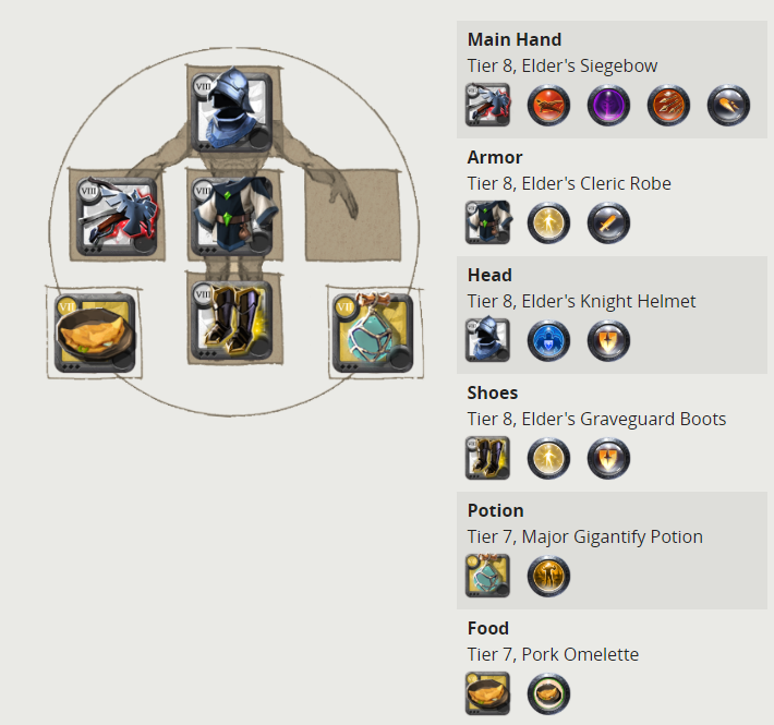 Siegebow, Knight helmet/Royal hood, Cleric robe, Graveguard boots