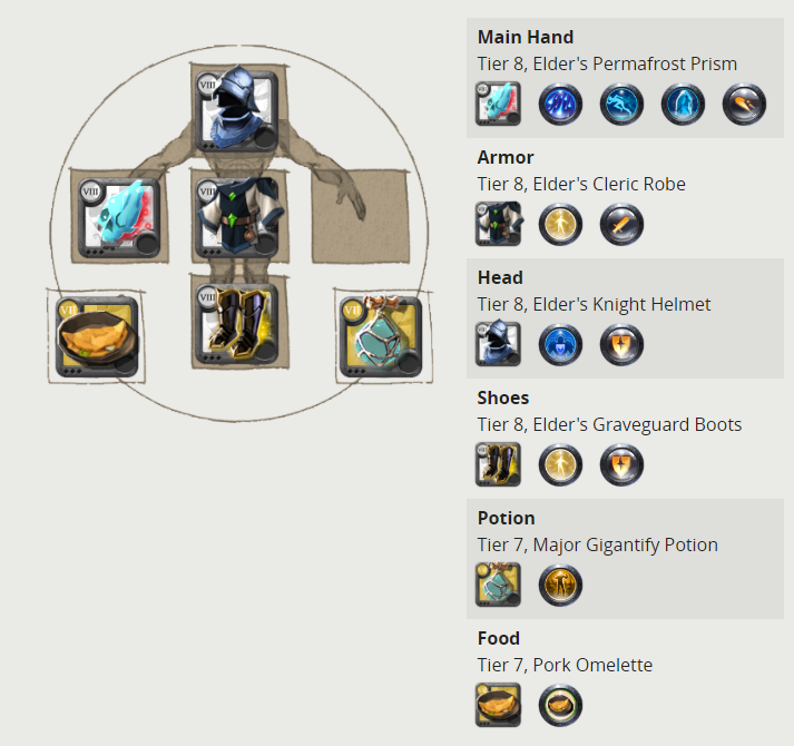 Permafrost Prism, Knight helmet, Cleric robe, Graveguard boots